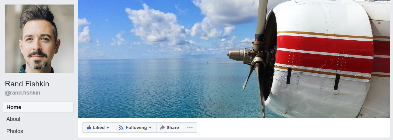 SEO marketer Rand Fishkin nails this technique by placing the tip of an airplane and full propeller on the right side of his cover photo.